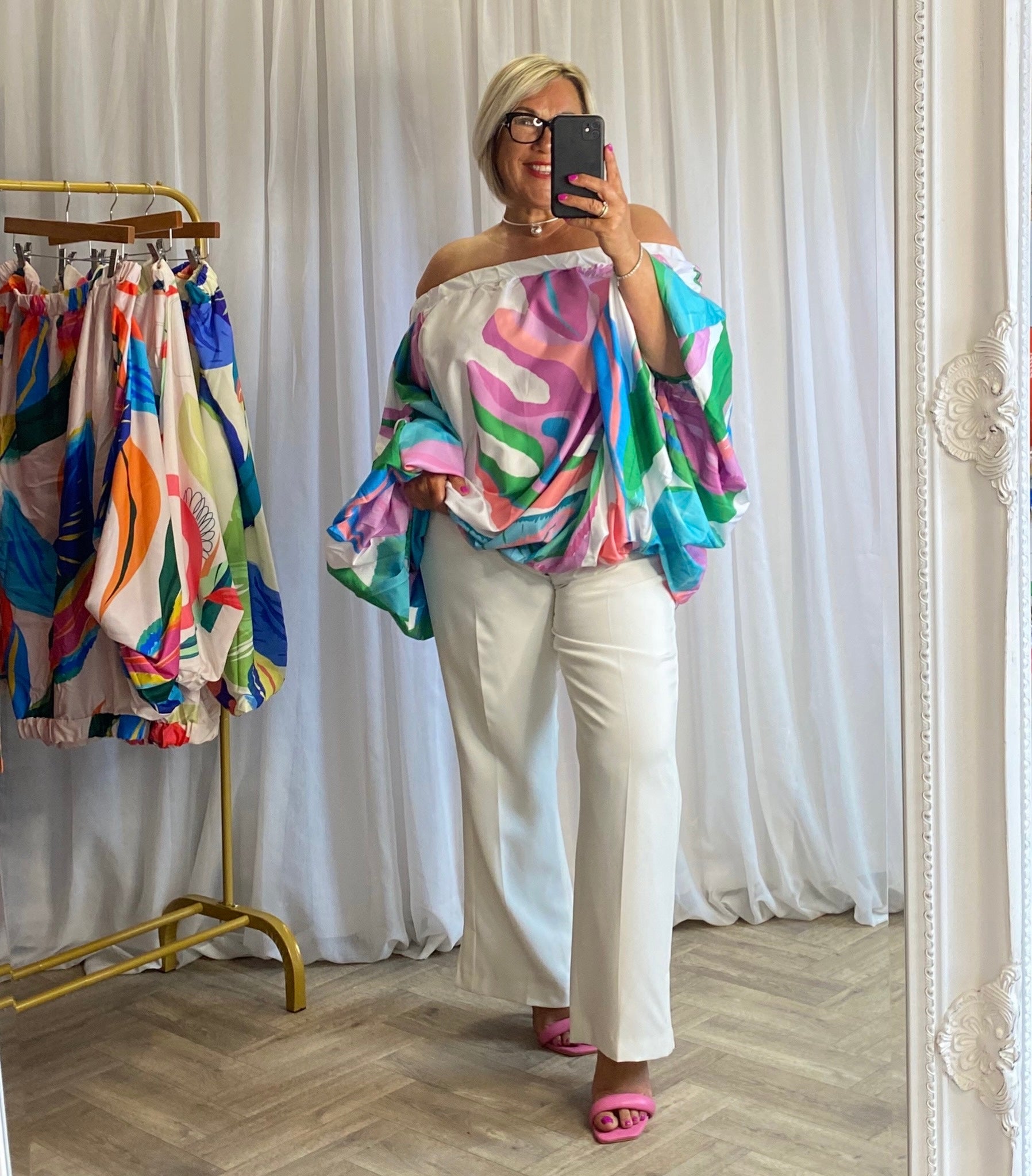 This gorgeous super flattering top / dress can be worn off the shoulder, on one shoulder off the other. As a top tuck her in , leave her out, wear longer or shorter or in / out. A perfect outfit out with the girls for brunch.